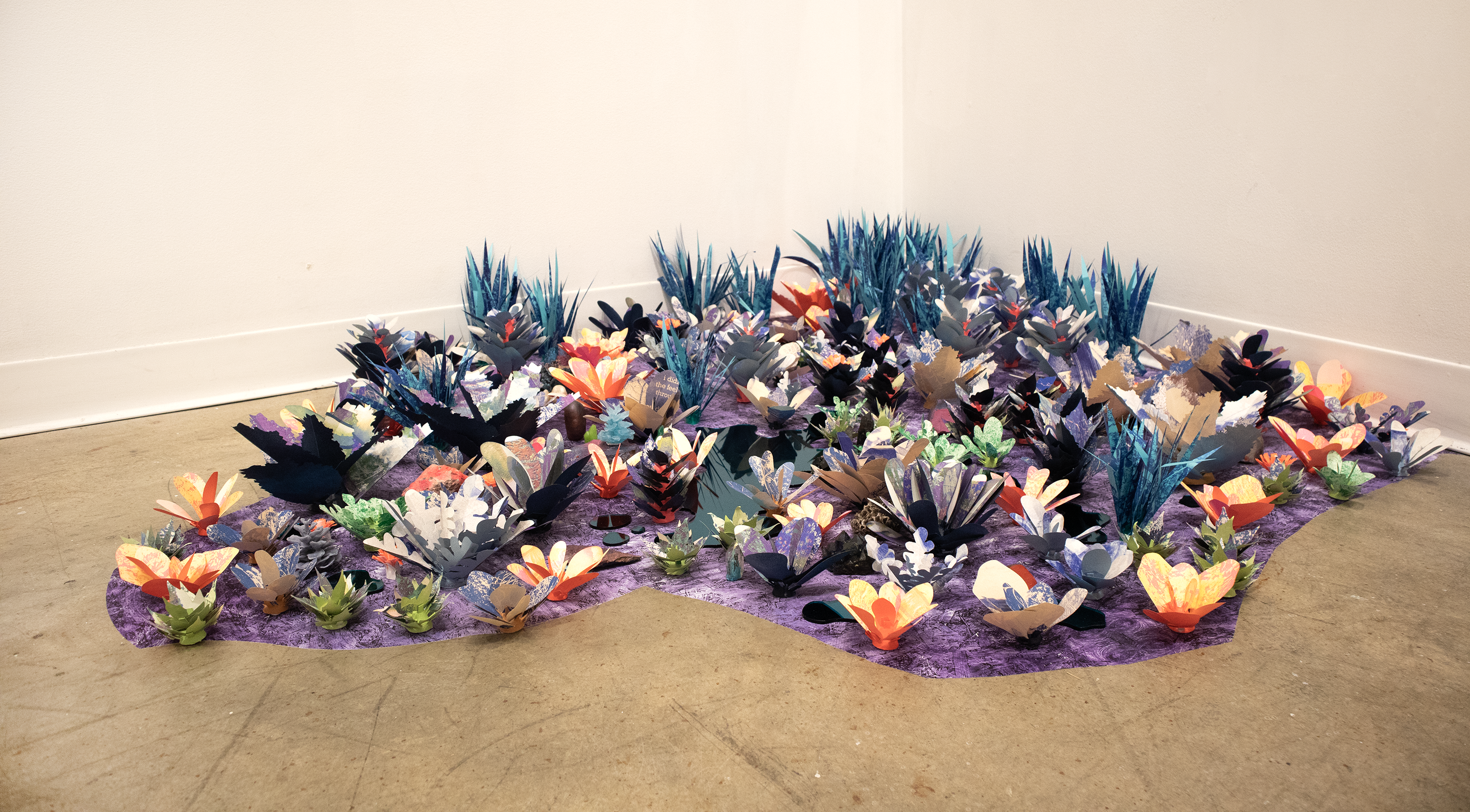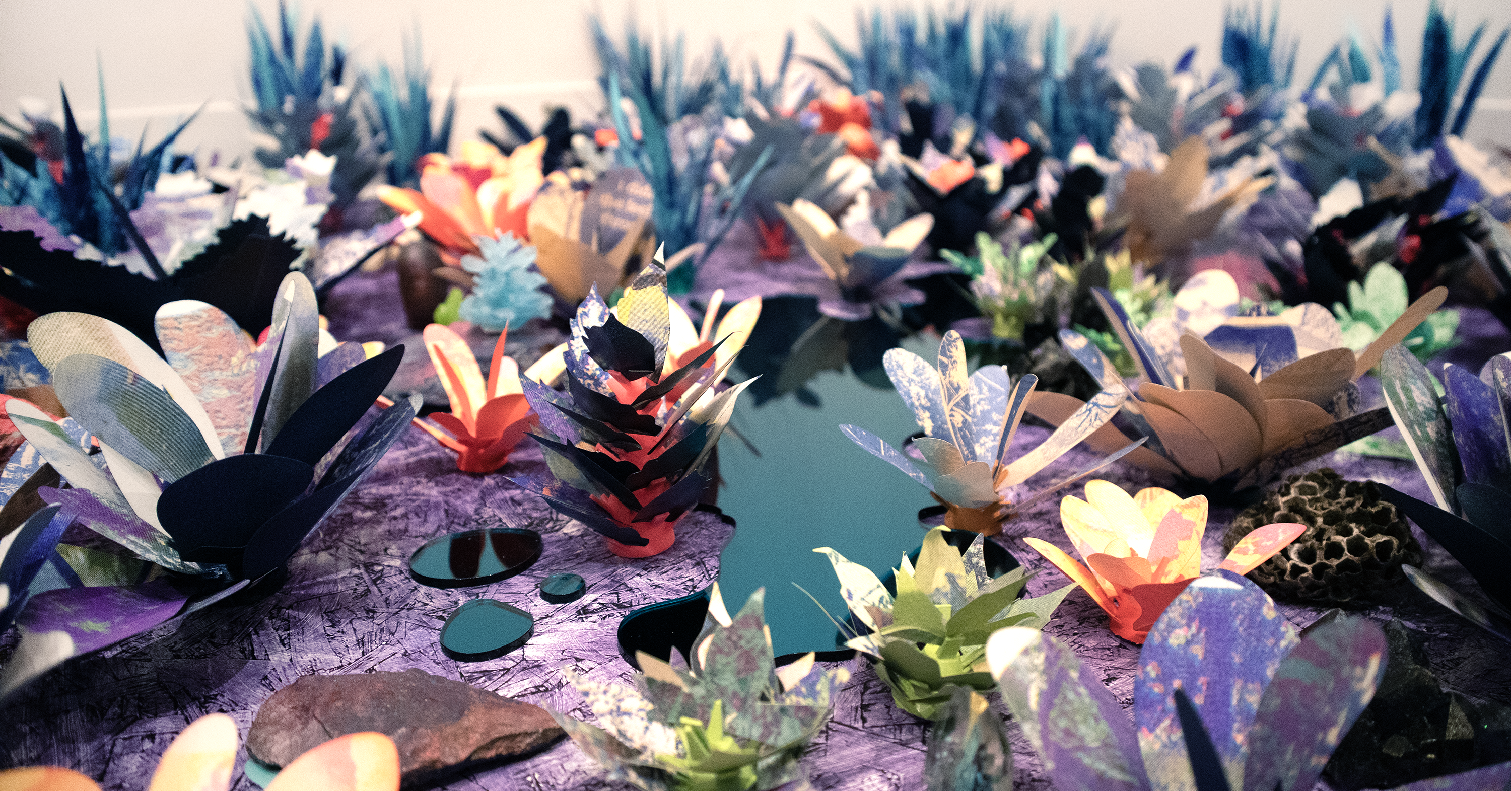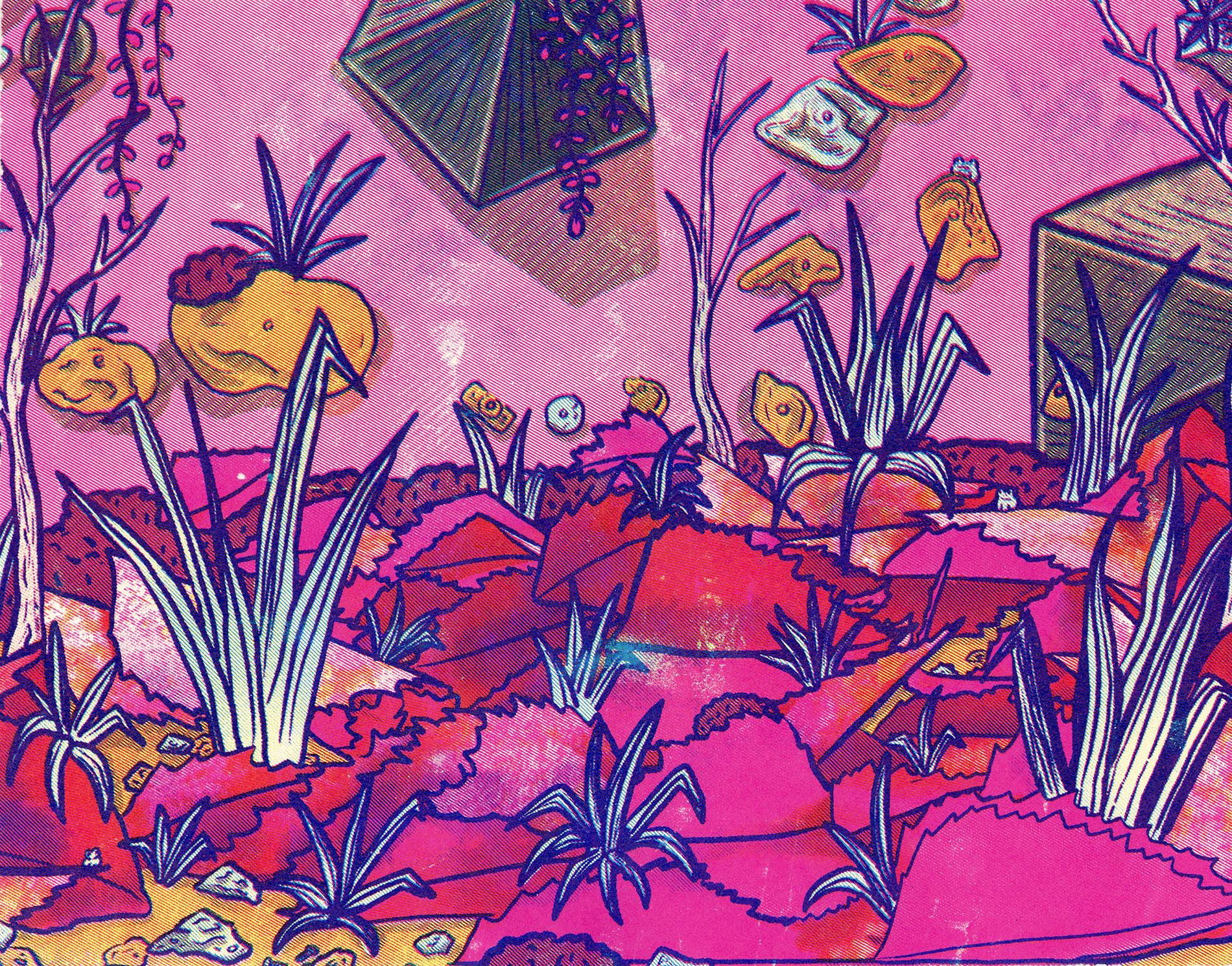 Installation of Risograph Prints, 3D-Prints, Plexiglass, Vinyl, Rocks, & Wasp Nest